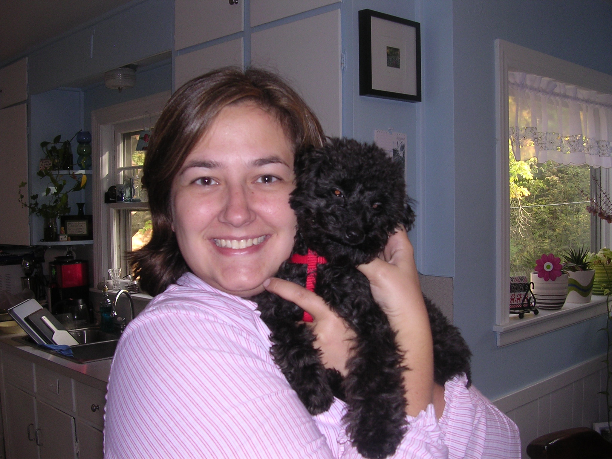I think perhaps Simon thought we would get a respectable dog, like a lab or a golden retriever, rather than a miniature poodle. Sorry about that. Our friends were going to pick up their second dog from a breeder here in town who only dealt with small dogs but she (the breeder) had somehow managed to get a mid-sized dog from one of her pairings, that was more in the acceptable-to-Simon size range (she thought it would grow to about 35 pounds). But that dog definitely wasn’t for us, the minute she put it in the kennel for us to check out, it climbed up and out of the enclosure. A dog that was an escape artist and way too full of energy was not what we were looking for; he ended up going to a home with three small boys. But then she mentioned she had a pair of black miniature poodles that would be available in a couple more weeks. She brought them out and I was smitten with the little ball of fur (George was about 3 pounds at that point and so adorable). Simon knew it was a lost cause to try to talk me out of getting him. Men are no match against the power of a tiny, cute dog.