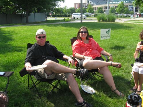 In closing, a photo of Simon and I tailgating before the U2 concert (why yes, that is a tattoo on my ankle – it’s the Chinese symbol for happiness; and yes, I verified that it really is that before getting it permanently applied to my body). Perfect company. Perfect weather. Perfect concert.