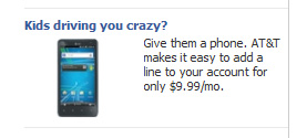 Speaking of mis-marketing, I saw this ad in my Facebook sidebar and it made me laugh since I’ve been complaining about my kids driving me crazy, but never in a million years would I consider buying them a phone as an option to end the crazy-making.