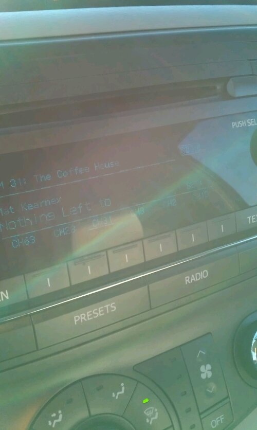 This is how I keep track of songs I like when I hear them on the radio – I take a picture of the radio panel – I have a whole series of these on my phone. I also email myself song titles when I hear them on TV shows.