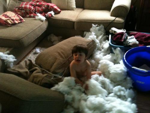 Besides which, Jack gives me plenty of opportunities to clean… though this particular mess happened on Simon’s watch so he had to clean it up ;). Unlike the time Jack covered the couch, carpet and wood floor (basically everywhere you see couch cushion stuffing above, except more on the cushions) with swirls of chocolate syrup, that was all my fun and responsibility.