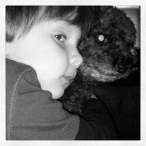Jack has amped up his affection-showing lately, always wanting to hug everyone in our immediate family, including poor George (ironically, his increased affection for us has not translated to affection for others and when you ask him to smile for or hug others, he staunchly refuses, typically with a look of disgust on his face – a real charmer, that one). George in general tries to steer clear of close proximity to the children but on this occasion, Jack was eating some food and George was hoping to get some so he got too close to Jack and was rewarded with a tight squeeze.