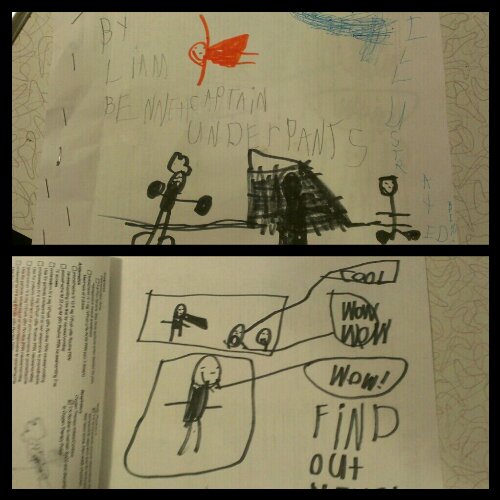 Liam’s also gotten into drawing comics – this is his redo of Captain Underpants. By Liam Bennett and Illustrated By Liam Bennett.