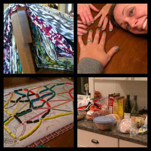 A collections of pics from my GWA (Girl’s Weekend Away)… clockwise from top, left: we made infinity scarves, painted our nails, ate yummy snacks and played Ticket to Ride (so fun!).