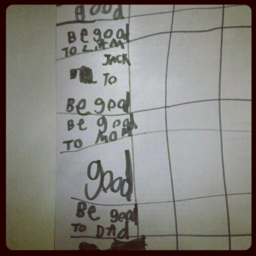 The boys decided it was time for a new sticker chart so they created their own, all categories have to do with being good, either in general or to specific people in our family. Apparently that is it.