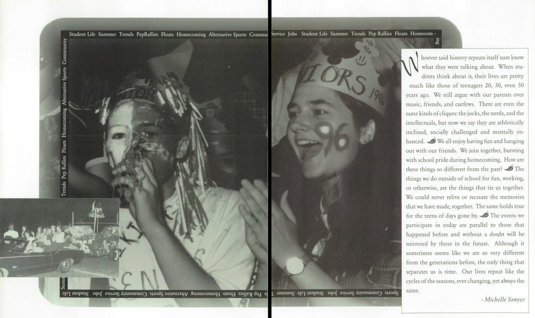 yearbook2And because my search for the class officer photo also uncovered a couple other gems from the yearbook I thought I should post them here for your viewing pleasure. Above is a pic of me and my friend, Josh, decked out for the Homecoming pep rally. And because I was also the yearbook editor, I wrote the article that is featured on the page – I was totally that person in high school, the over-achiever. I’d be apologetic about that, but I’m not really sorry. I was also the girl who was on winter homecoming court my junior year (below). And, yes, Mr. Junior has black painted nails; he’s now all grown up, married to a girl we went to high school with and has two kids.
