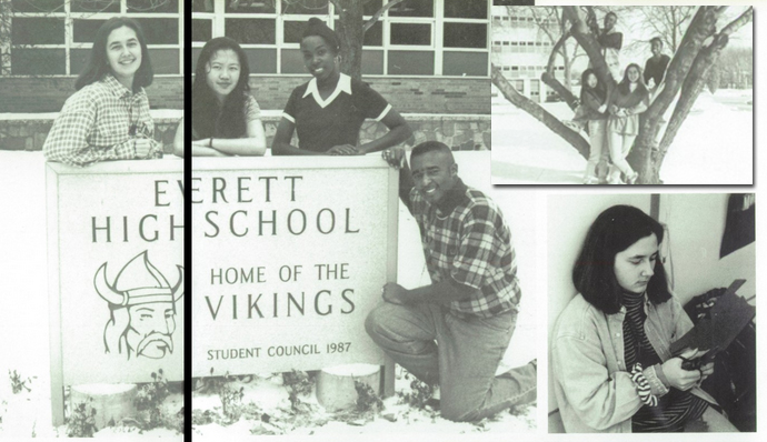 yearbook_classofficerSenior year class officers (left) and junior year (small inset on right) – humorously, all the same people two years in a row, mostly because I think our class was too, shall we say, lazy to elect new people (clearly we were not so intimidating that others wouldn’t run, to wit: the photo on the bottom right is also me and yes, I am wearing a turtleneck, denim shirt and a scrunchie on my arm. I am Michelle Fierce.)