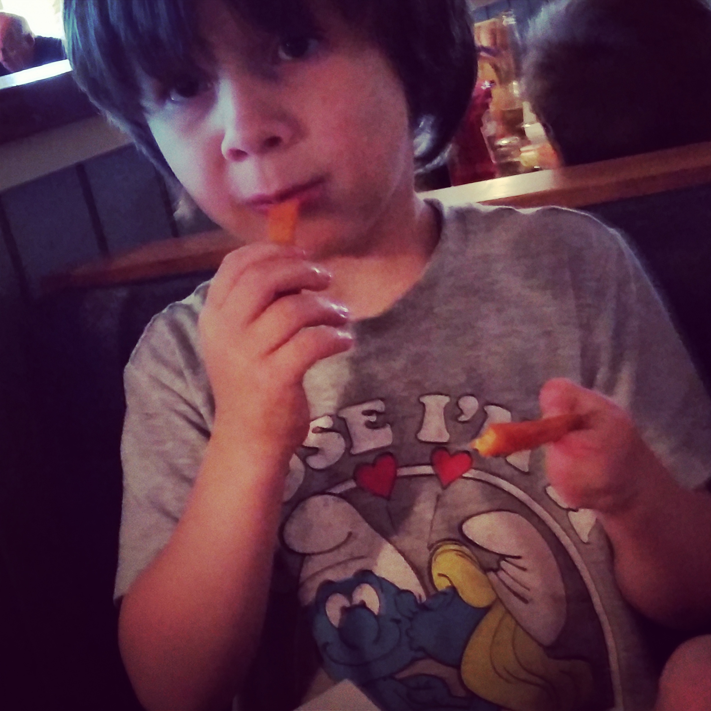 Trying something new: sweet potato fries. Also, please note that this kid wore his sweatshirt at daycare this day to cover up the “kissing” on his t-shirt.