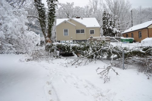 I woke up at 2 a.m. Australia time to hearing Simon on the phone with our neighbor – middle-of-the-night calls are never good. I can hear him saying something about glass and a vehicle. I’m immediately WIDE awake. This is not good indeed. It apparently rained the day before, then the temps dropped, freezing everything and then snowed. Our tree could not hold up and decided to just lay down and take a rest – nature is stressful. Sadly, our car and fence were in the way when it came down (thankfully it wasn’t our newer minivan or our very new roof). Ron said he’d send us some photos and we told him we’d get one of our friends over to check it out. I called Tracey, who was checking in on our house and had the spare key and asked if she could go to the house and see about getting an auto glass place to come out and replace the back window [if only]. At this time we had no idea of the damage that had happened. We also called our insurance agent and let him know what had happened and gave him Tracey’s number. In the meantime our other neighbor had called my dad (who lives in a different city, with a different last name – strange, but whatever) and let him know a branch had fallen off our tree so my dad called our friends Kara and Andy to have them check it out. Then we had to just let it go because there was not much else we could do from Australia. We did not, however, end up falling back asleep.