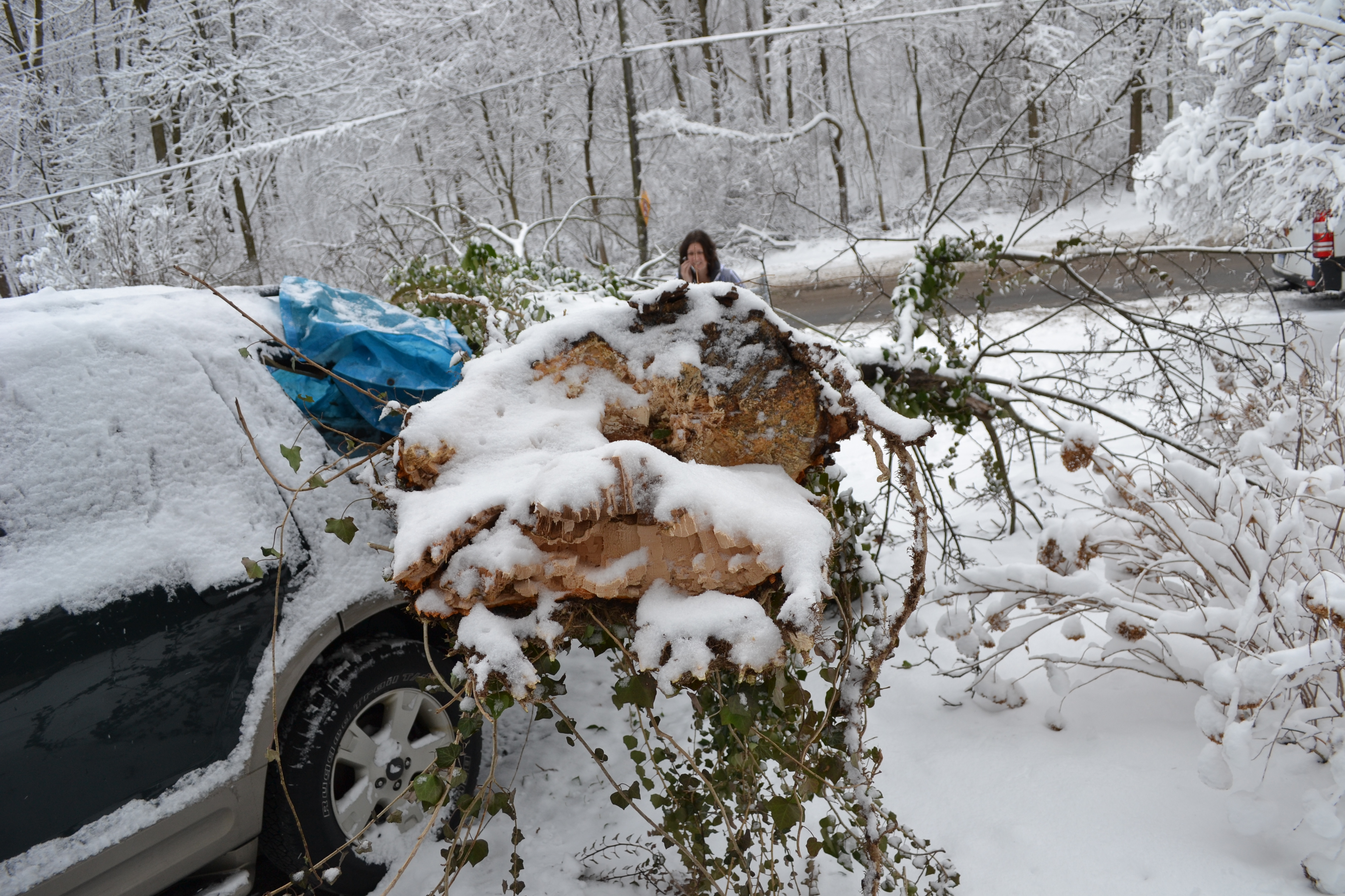 Andy made it to the house before everyone else and immediately let everyone know things were not as simple as imagined. The tree was halfway into the street and our car was possibly not driveable (turns out it was – thanks, Kevin, for taking it to the dealership). Andy got to work with his new chainsaw (which he was so happy to use, though I don’t imagine he thought it would be so soon after getting it).